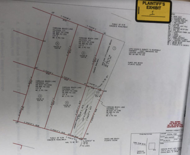 The town recently discovered an adjacent parcel crossing the sidewalk is partially owned by the county. Town manager Bruce Oakley told PCD the jointly owned property “either abuts or encroaches” the property owned by Carolina Beach Land Holdings specified in the suit.