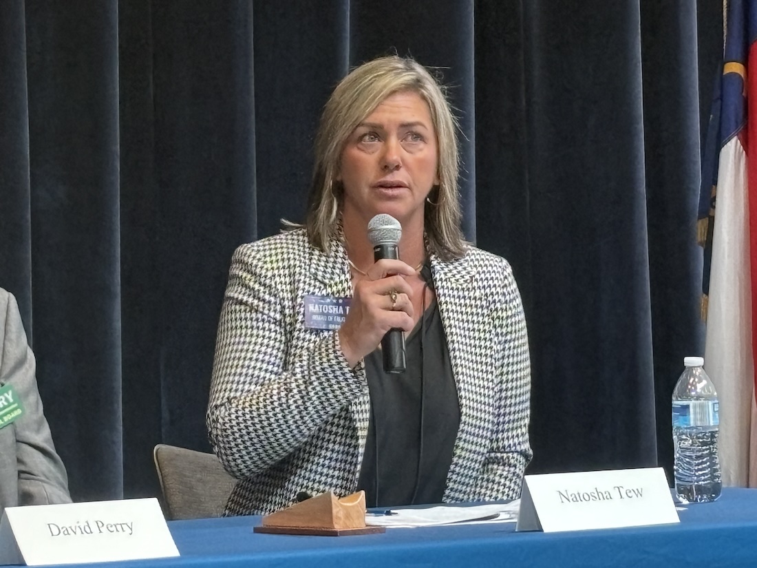 Tew was asked to address disinformation on Covid-19, particularly a comment at a 2022 school board meeting where she claimed athletes were dropping dead after getting a Covid-19 vaccination.