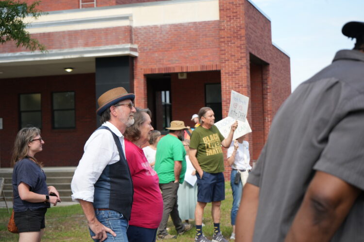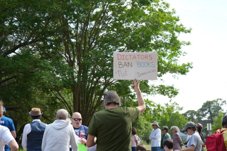 Democrat Judy Justice also spoke at the rally, organized by New Hanover County Educational Justice. Upward of 80 people attended, brandishing signs reading “Dictators ban books” and “Ban racism not books.”