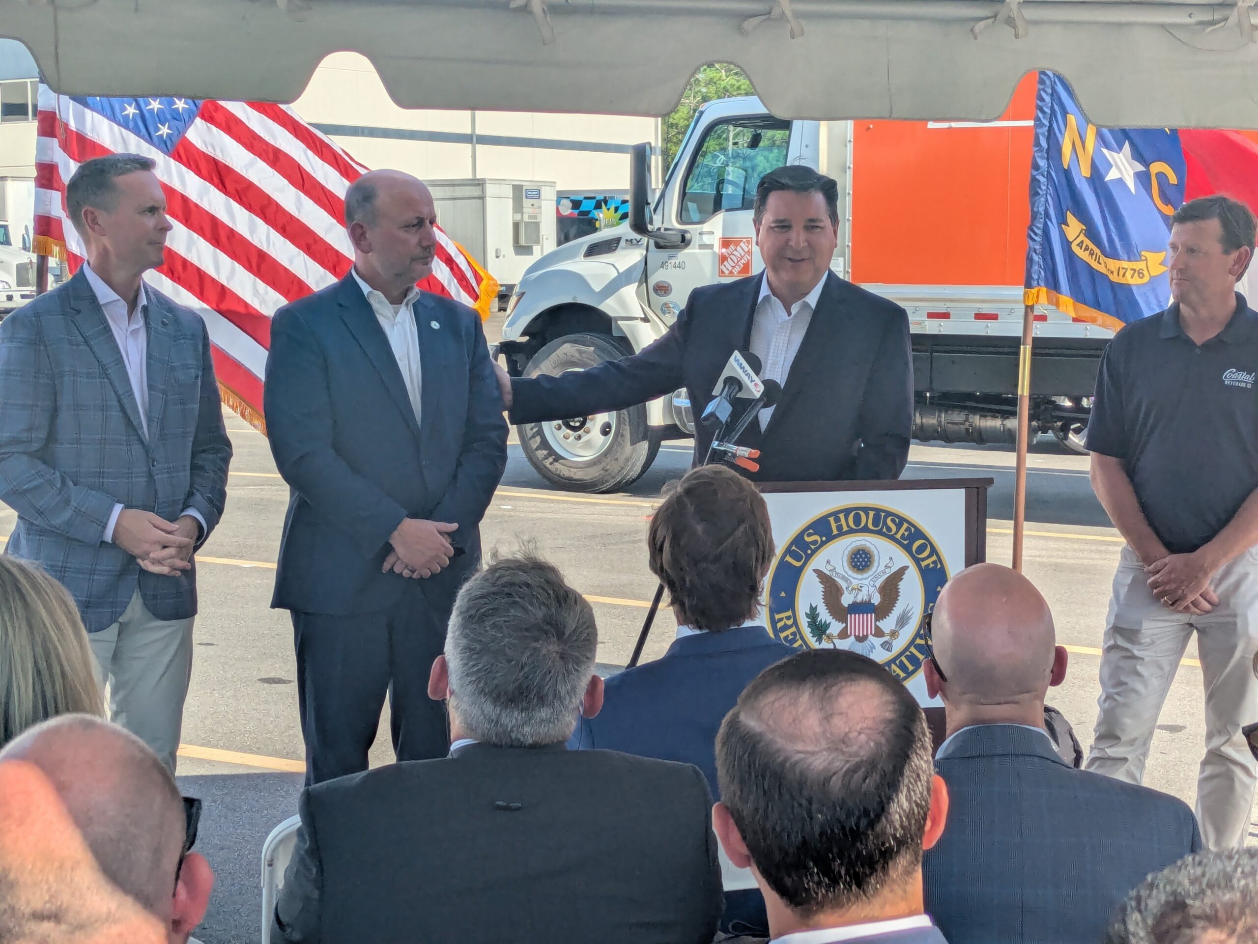 U.S. Congressman David Rouzer (R-NC-7), North Carolina Department of Transportation Secretary Joey Hopkins, Head of Government Affairs for the U.S. Chamber of Commerce Rodney Davis, and Coastal Beverage Company President Tee Nunnelee participated in a press conference at the Coastal Beverage Company in Wilmington to discuss a multi-year authorization that sets national transportation policy and funding levels, through a combination of dedicated funding and grants. The legislation impacts everything from highway construction to public transit, freight rail, and port infrastructure. The main goal is to provide states and local governments with long-term financial certainty so they can plan and execute major projects.