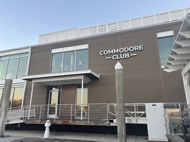 Operating since 2024, the Commodore Club is located at 6 Marina Street, with membership costing $32,500 — not including application fees and annual dues at $2,500. Last reported in 2024, the club had 400 memberships; members are encouraged to dock at the marina before dining at the club.
