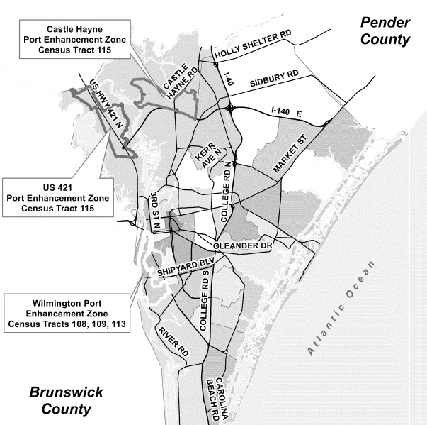 With assistance from Wilmington Business Development, the county is requesting approval from the state of three areas as port enhancement zones: 2,316 acres along the U.S. 421 corridor, generally north of its interchange with Interstate 140; 1,450 acres surrounding and including the Port of Wilmington; and 1,989 acres south of Castle Hayne, along the north side of Interstate 140.