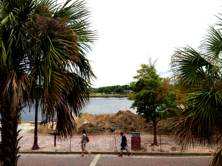 A bulletin from the City of Wilmington said the U.S. Coast Guard, which owns the site, is continuing exploratory work there–high mounds of dirt behind orange, plastic fencing kept foot traffic away this week–and plans to fill the sinkhole adjacent to the bulkhead in the week of Aug. 19.