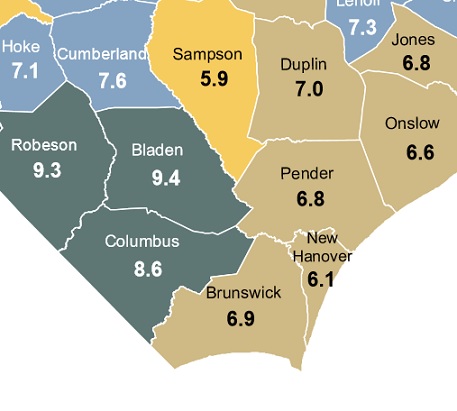 Pender County’s labor force of 24,918 included nearly 1,700 residents out for jobs–a 6.8 percent rate.