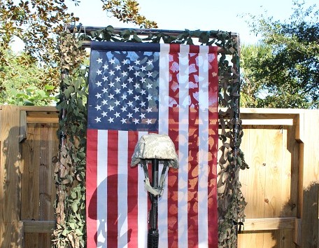 A group of Cape Fear Chordsmen singers–all veterans–performed the National Anthem and “Follow the Flag.” The honor guard presented a three-rifle salute and presented a flag to Durwood’s family. The Patriot Honor Guards of N.C. stood at attention in their “Human Wall for Fallen Soldiers.”