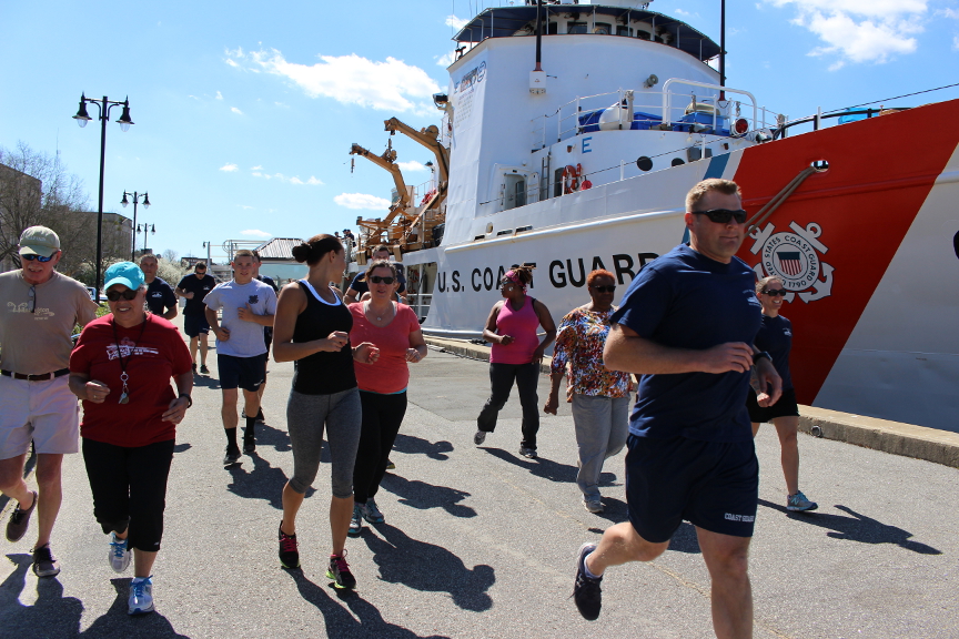 Eight community members joined more than 15 crew members to learn what it’s like to stay fit for the Coast Guard. During a mile and a half run along the Cape Fear Riverfront, the crew set up several stations along the boardwalk, which included push-ups, squats, lunges, bear crawls and more. The workout started at the the Diligence homeport, continued to Port City Marina and then backtracked to the ship.