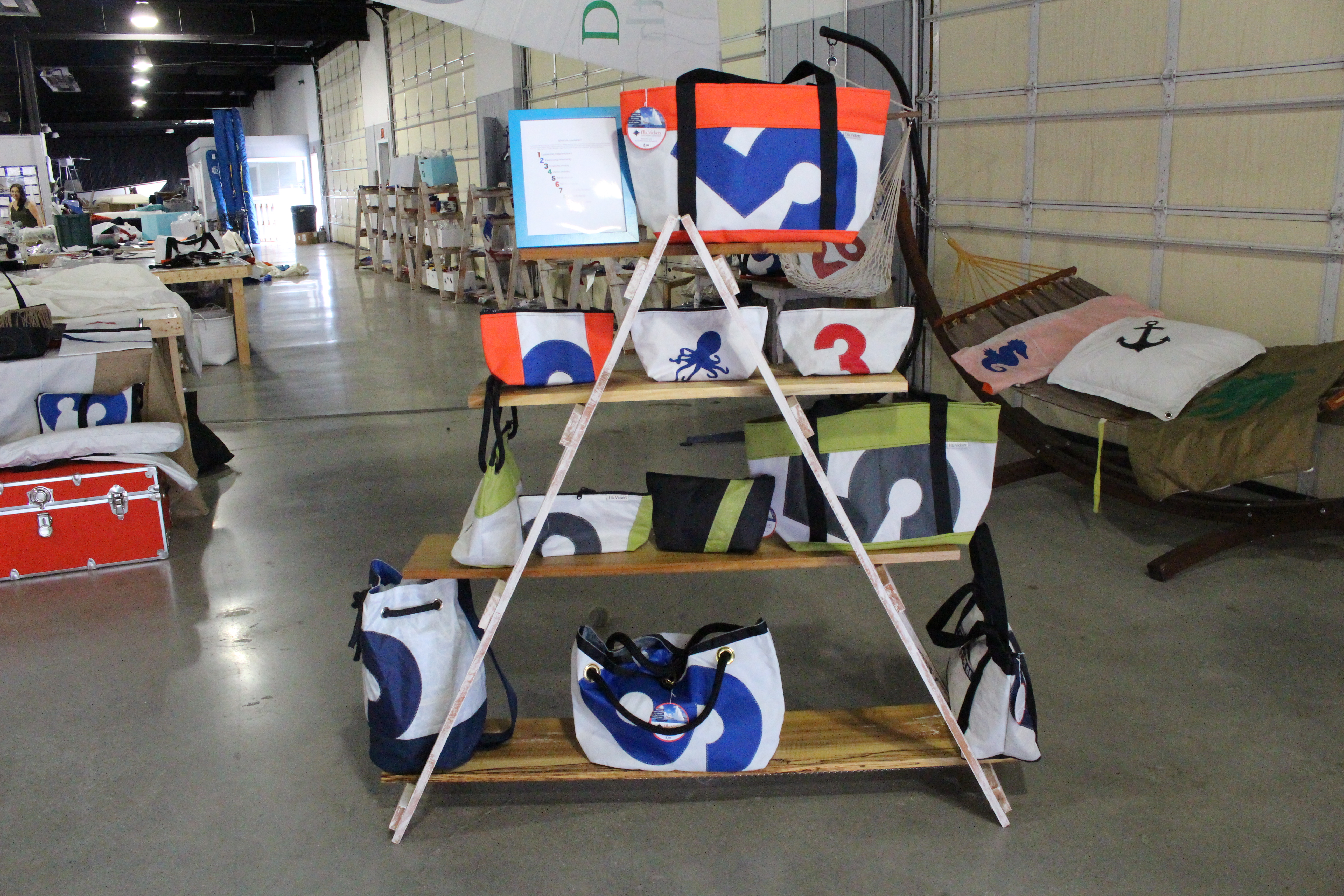 Ella Vickers’ company has been recycling sailcloth into handbags since 1989. The Wilmington-based business, located right before the bridge to Wrightsville Beach, has a factory-store full of unique designs.