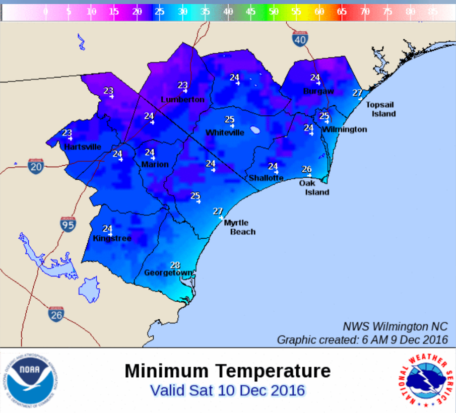 According to a report from the National Weather Service, temperatures are expected to dip down into the low to mid-20s Saturday morning and the upper 20s on Sunday morning.