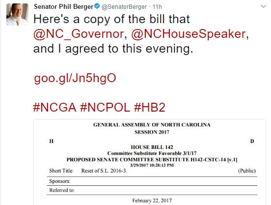 Butler said Democrats expect to see an already-existing bill come from committee to the floor by noon. Indeed, it was House Bill 142, which Senate Leader Phil Berger posted on Twitter late Wednesday night as having been agreed on by Governor Roy Cooper and House leaderships.
