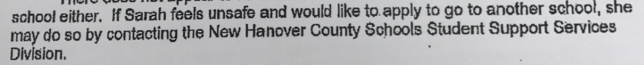 Sarah Johnson’s assailant appeared in court on May 5. Two days later, the New Hanover School system finally responded to Johnson, sending a letter saying it would not take any action, including the type of investigation mandated by Title IX (the first bullet point of the OCR guidelines includes the “right to have your school investigate what happened”). In the May 7 letter, the school suggests that “if Sarah feels unsafe and would like to apply to go to another school, she may do so.”