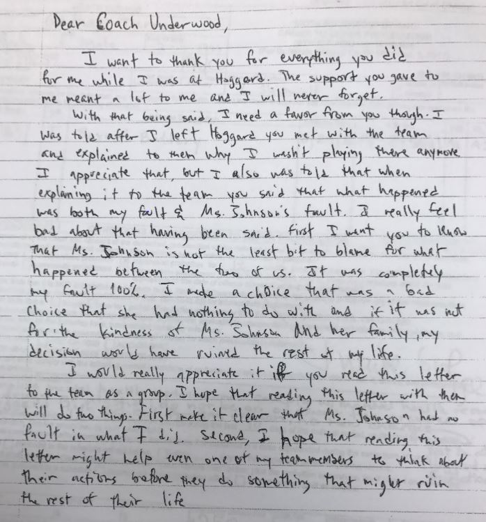The exact nature of what Underwood said to the Hoggard football team is unknown. However, a letter acquired by Port City Daily, written by the assailant to Coach Underwood, seemed to support the Johnsons’ allegations. The letter thanked Underwood for “everything you did for me while I was at Hoggard” and then explicitly asked Underwood to reverse his statement that “what happened was both my fault and Ms. Johnson’s fault,” in front of the Hoggard football team.