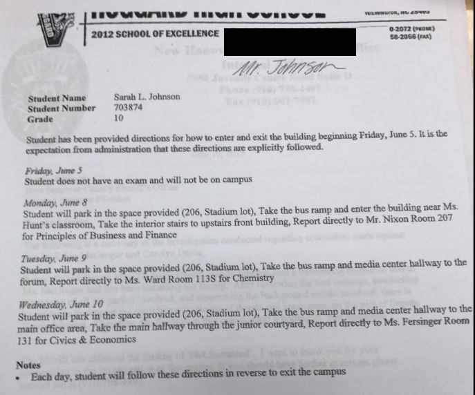 That fall, Sarah Johnson said she returned to Hoggard, but suffered from anxiety attacks and depression. Sarah Johnson medically withdrew from school and enrolled online. Frustrated with what he described as an “utter lack of care” and “unwillingness to meet” on the part of the school, Randy Johnson filed a complaint with the Department of Education’s Office of Civil Rights.
