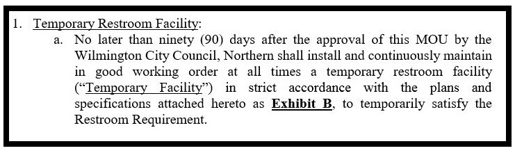 The MOU included specific designs for the bathrooms – and specific penalties for not completing them within 90 days. According to the agreement, if NRMH did not provide these bathrooms in time, they would pay the City of Wilmington $250,000 and the city would then take over the bathroom project.