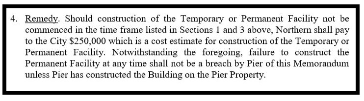 The deal – known as a Memorandum of Understanding (MOU) – between the City and Northern Riverfront Marina and Hotel (NRMH) – allowed BlackFinn to use its own bathroom to satisfy the public bathroom requirements, but only for 90 days. After that, the deal required NRMH to build temporary bathrooms. (All of the documents referenced in this article are attached in full at the bottom of this page.)