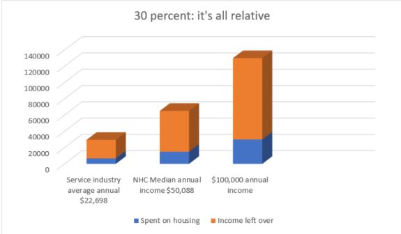 “It’s a pretty crude marker. Spending 30 percent of your gross income when you make $100,000 a year leaves you with $70,000 for everything else. Spending 30 percent when you make $10,000 leaves you with $7,000 for everything else – you’ve got to eat the same as the person making $100,000, you have the same clothing needs, so it is a pretty crude measure,” Executive Director for Cape Fear Habitat for Humanity Steve Spain said.
