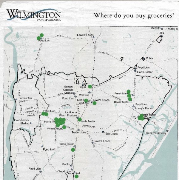 The lack of grocery store options for the downtown region were highlighted by a map plotted with grocery stores that residents of downtown shop at. Most of the stores people reportedly shop at are located east of downtown, with a focus on the Oleander Drive area.