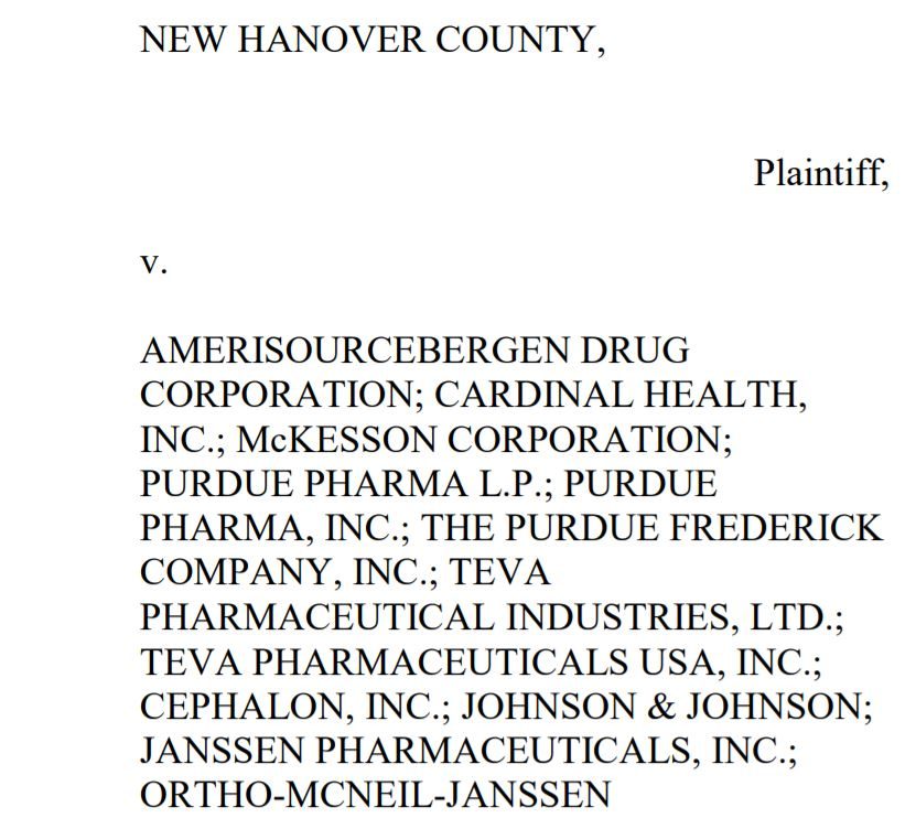 WILMINGTON — New Hanover County has filed a lawsuit against five of the largest manufacturers and distributers of prescription opioids.