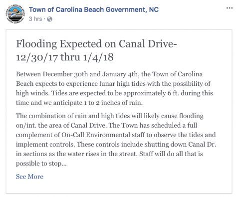 Canal Drive in Carolina Beach is subject to frequent flooding. Between the marina and the oceanfront, Canal Drive will often flood while high tides and heavy rain coincide.