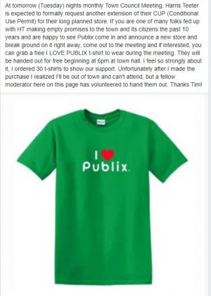 He decided to order 30 green t-shirts that read “I love Publix” and hand them out at the door at tonight’s council meeting.