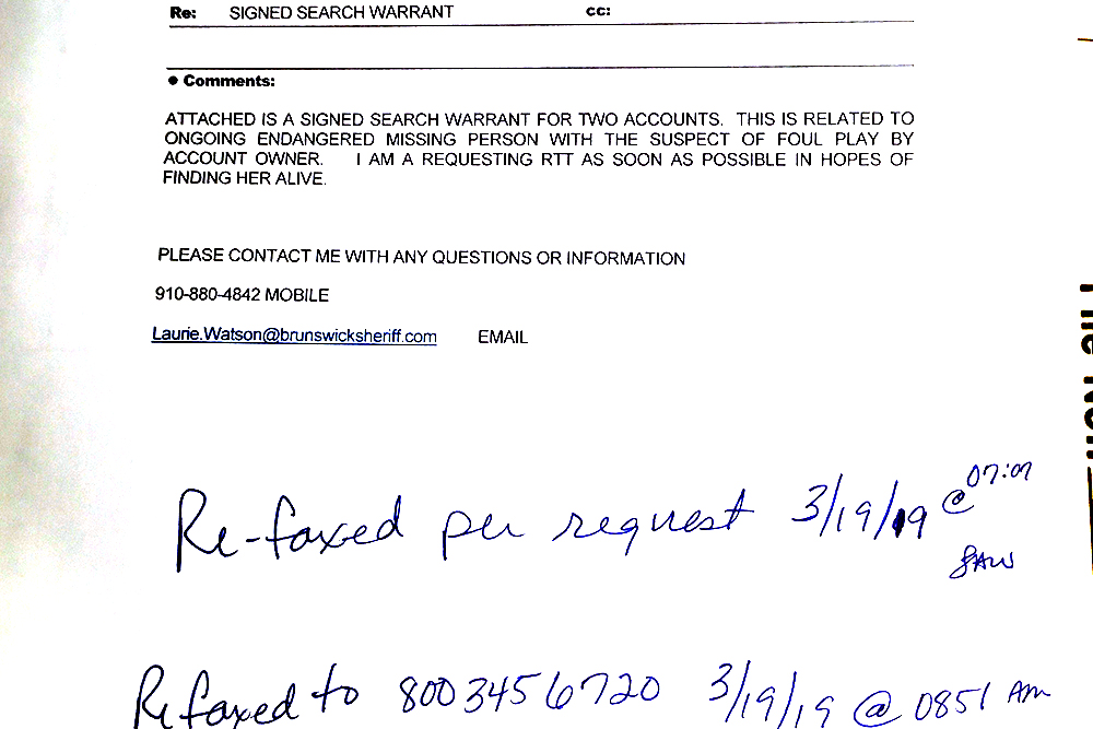 Investigators believed Judy Brock could still be alive. After issuing the first search warrant to Verizon Wireless on the afternoon of March 18, Major Laurie Watson with the Brunswick County Sheriff’s Office re-faxed it twice the next morning, at 7:03 a.m. and at 8:51 a.m. with the urgent message: