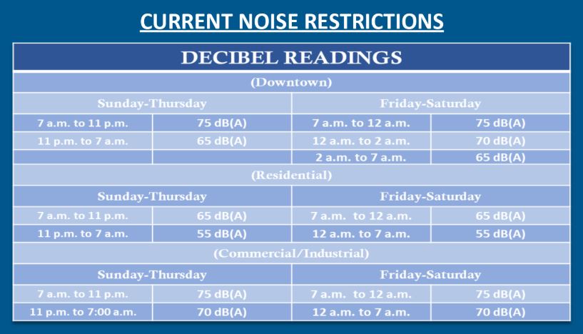 Instead, Everhart proposed removing complications and enforcing 6 a.m. to 11 p.m. noise restrictions across the city. Maximum decibel (dB) ranges that vary depending on zoning district would remain in place. However, the maximum level of noise permitted will be lowered, with a maximum of 65 dB downtown, 55 dB in residential areas, and 70 dB in commercial or industrial areas.