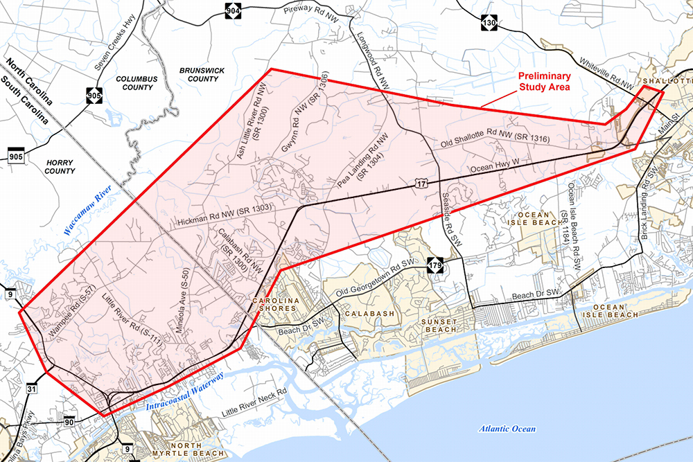 Approximately five miles in Horry County and 14 miles in Brunswick County are included in the project’s study area.
