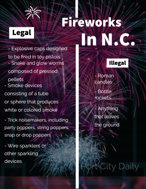 WILMINGTON—If you’re planning to drive across the border to score some fireworks, you may want to think again. In North Carolina, possessing, purchasing and using most all fireworks by untrained individuals could result in up to six months in jail.