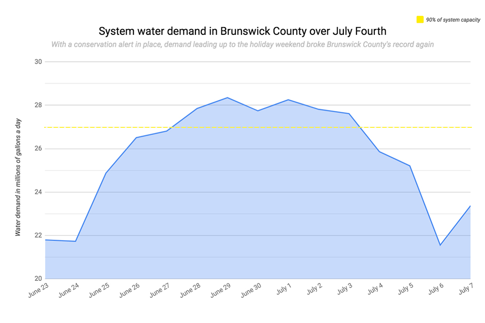 Before this dry summer season, Brunswick County’s previous daily water demand record was July 10, 2015, at 87.46% of capacity.