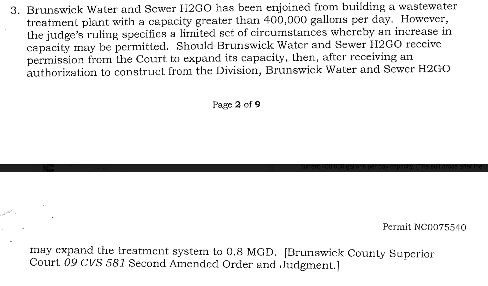 Superior Court Judge Jack Hooks, Jr. ultimately sided with the county. An August 2010 court order bars H2GO from expanding the plant’s capacity beyond 400,000 gpd. H2GO appealed the order but later rescinded its filing.