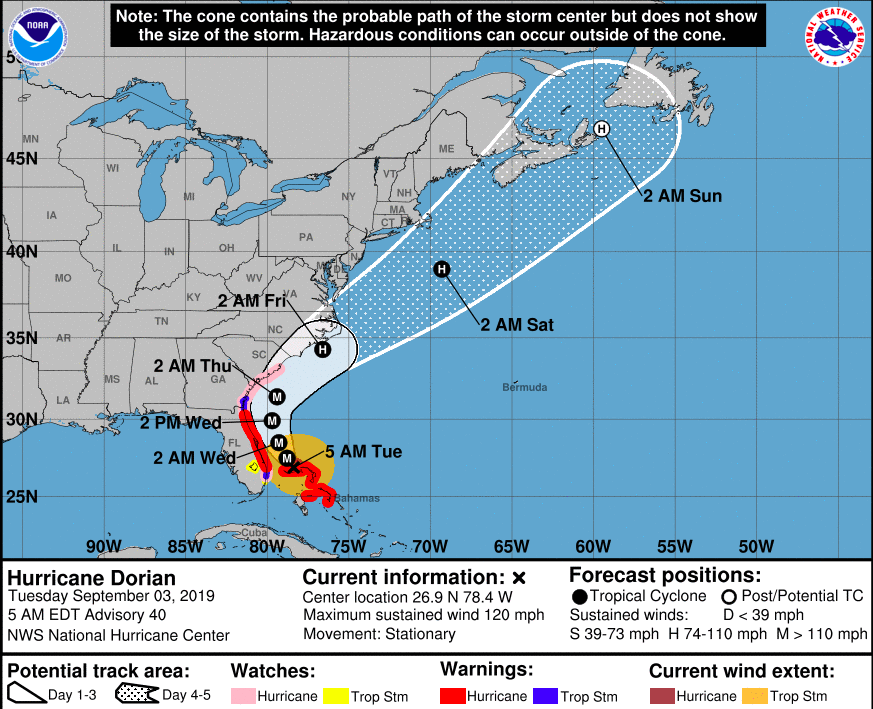 According to the National Hurricane Center (NHC), “Dorian continues to pound Grand Bahama Island early this morning while moving little. The eyewall has become a little less defined over the past few hours on radar. On infrared satellite images, the eye remains fairly well defined, but the surrounding deep convection is somewhat fragmented.”