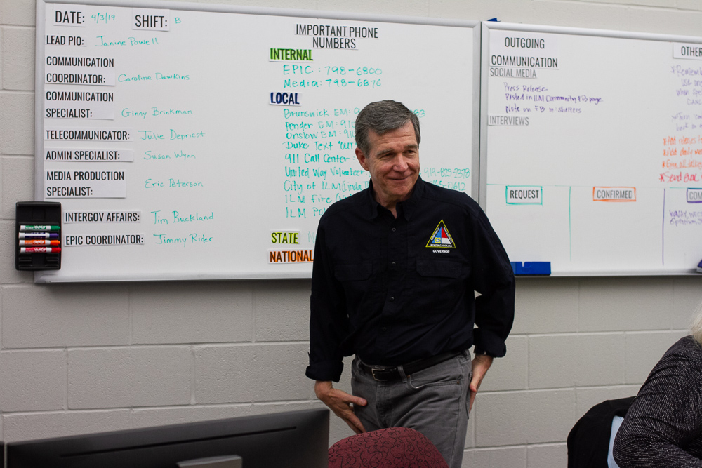 North Carolina Governor Roy Cooper visited the Emergency Operations Center (EOC) Tuesday to tour the facilities, meet emergency operations personnel, address the media, and talk with various elected officials in the region.