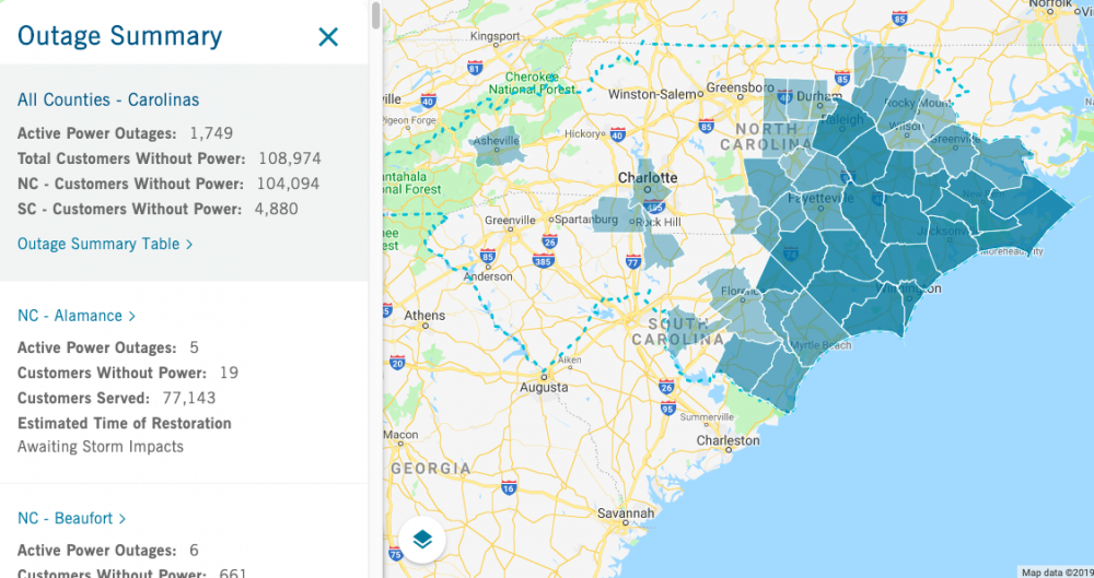 According to the Duke Energy outage map, nearly 110,000 customers are without power across North and South Carolina. Crews are ready to respond but when power can be expected to return is not yet known as the power provider waits to assess the damages across the region from the storm.
