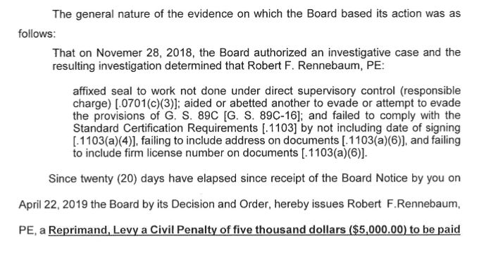 In November of 2018 – at the same time NCBELS put ATS in Wilmington on notice – the engineering board investigated Rennebaum. On May 28, 2019, NCBELS formally reprimanded Rennebaum for this, charging him with affixing his seal on work not done under his own supervision and determining that he had “aided or abetted another to evade or attempt to evade the provisions” of state law. NCBELS fined Rennebaum $5,000 and ordered him to take a remedial ethics course.