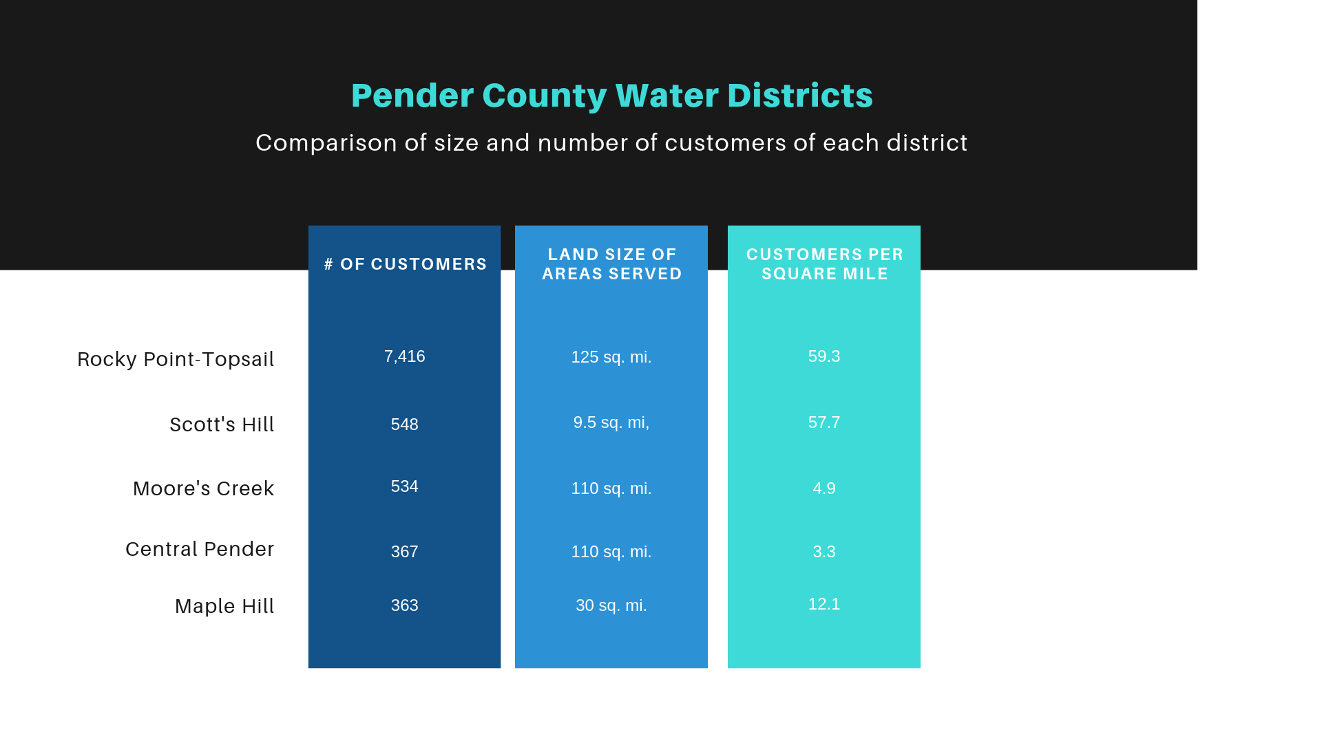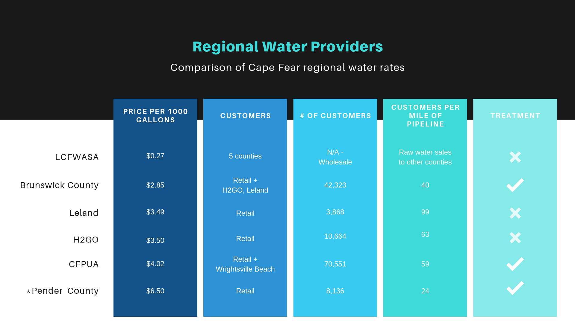 According to Pender County Chairman George Brown, these higher rates are based on operating a system that delivers water to far fewer customers per mile of pipeline — between 60% to 315% fewer customers per mile of pipeline, according to figures provided by the county. PCU has an average of 24 customers per mile of water pipeline, compared to 59 (CFPUA), 63 (H2GO), and 99 (Leland).