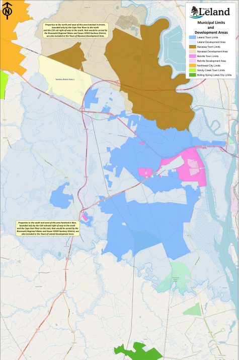 In its press release, Belville claims Leland has inserted unrelated annexation agreements within the proposed settlement agreement. A map provided in the release, which appears to have been created by Leland, shows large swaths of land outside of current Leland municipal limits depicted as “development areas” (view the full map below).