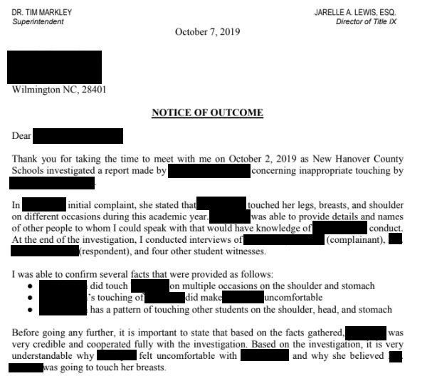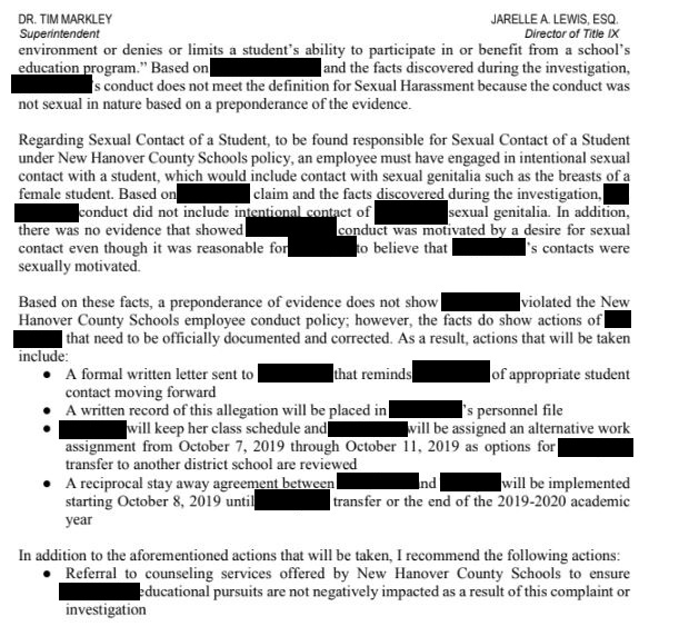 While the new Title IX director for New Hanover County Schools (NHCS) found that the teacher had not violated policies prohibiting sexual harassment and sexual contact with students, questions remain about how the district responded to the incident, including whether the teacher’s pattern of behavior was a violation of other policies. It also remains unclear why an administrator asked the student and the teacher to sign a form usually used to mediate disputes between students; the form includes, among other requirements, a prohibition from talking about the incident.