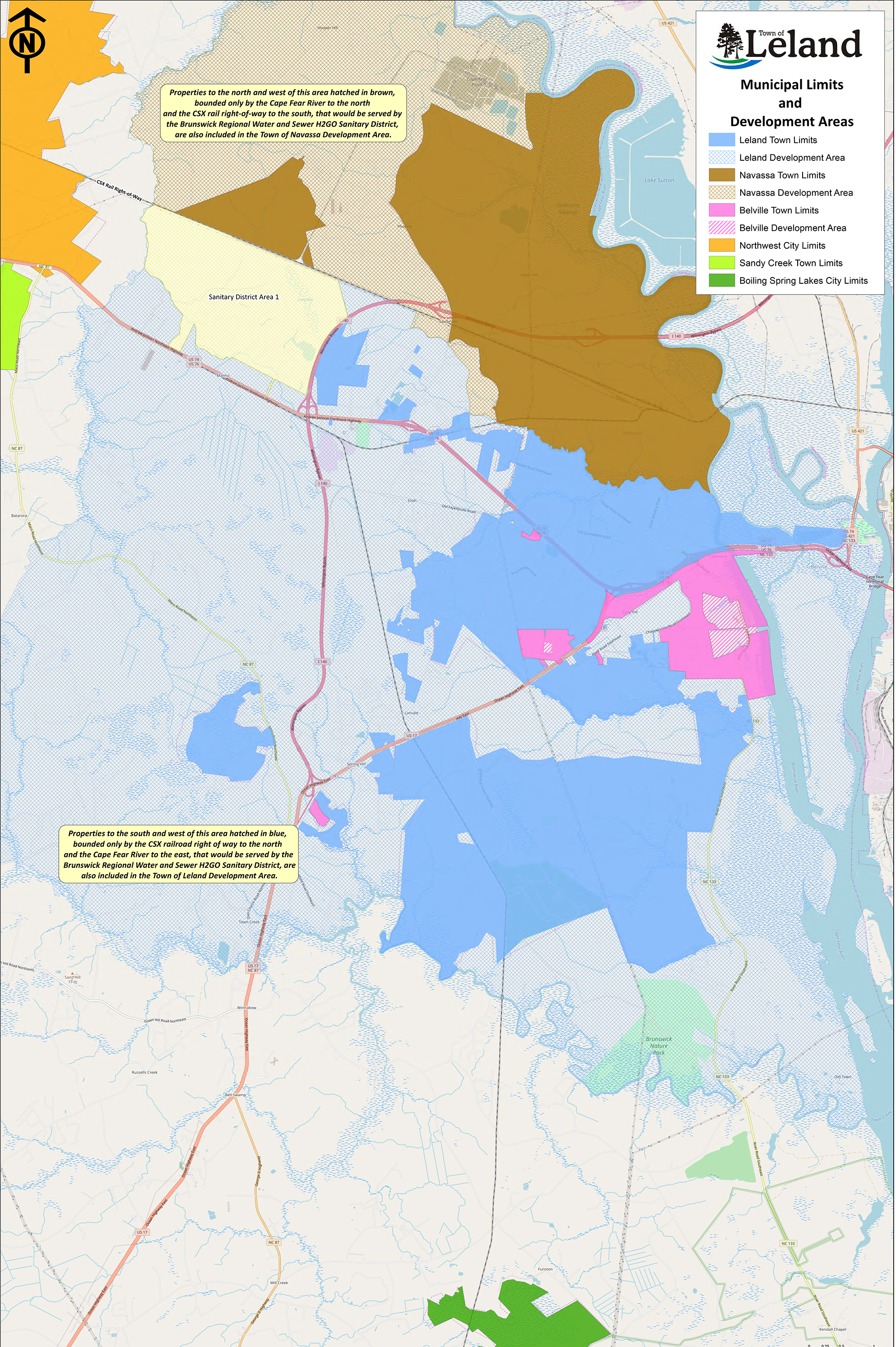 Hours before H2GO’s meeting last week, where “it was anticipated that the commissioners would vote on the proposed plan,” according to a post in a neighborhood email chain by the Chairman’s wife, June Gerken, Belville shared a surprising press release. The release shared a copy of a map, purportedly included as part of “unrelated annexation agreements” included in the interlocal agreement. The map, which bears the Town of Leland’s logo, assigns areas well outside of town limits as “Leland Development Areas.”