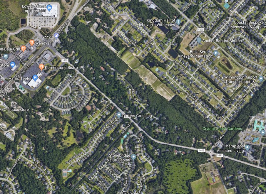 The property is located just north of the intersection of Market Street and Porters Neck Road, just before the multiple overpasses connecting US-17 with Market Street and I-140. It’s not clear from the most recent site plan submitted by the developers if the project will connect to Market Street proper, or only to the neighboring subdivision roads.