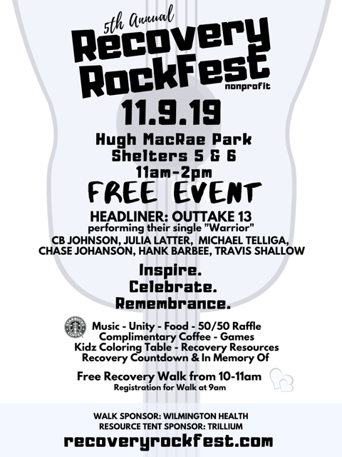 The event kicks off with a free “recovery walk,” supported by Wilmington Health. There will also be a ‘recovery resource information tent’ supported by Trillium Health Resources. The event will offer food, games, a “Kiz Zone coloring table,” and 50/50 raffle.