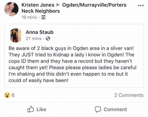 The post read: Be aware of 2 black guys in Ogden area in a silver van! They JUST tried to kidnap a lady i [sic] know in Ogden! The cops ID them and they have a record but they haven’t caught them yet! Please Please Please ladies be careful I’m shaking and this didn’t even happen to me but it could of easily have been!
