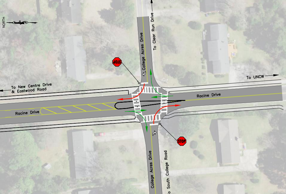 - “4-way Stop Control. Vehicular traffic on Racine Drive is too heavy for Stop sign control. Queueing from potential stop signs on Racine would back up traffic both into UNCW and northward on Racine exacerbating already difficult management of traffic.