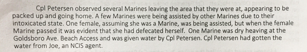Petersen gave water to a Marine who was dry heaving at the Goldsboro Avenue beach access, water given to him by an agent with the Naval Criminal Investigative Services (NCIS), according to his report; it was not clear why the NCIS agent was there.