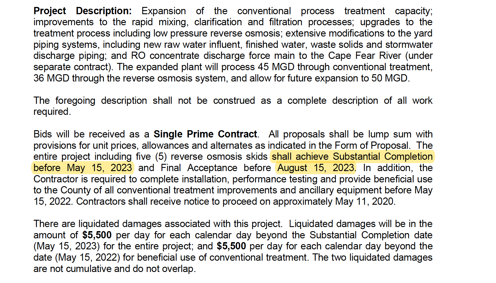According to Brunswick County, the May 2023 substantial completion deadline only applies to four bid alternatives. One alternative has a November 2022 operational use deadline for RO; this would provide contaminant-free water earlier than the four prolonged alternatives but still nearly one year later than first proposed.