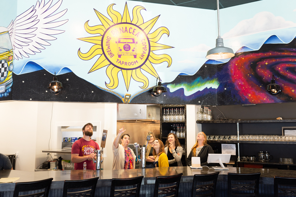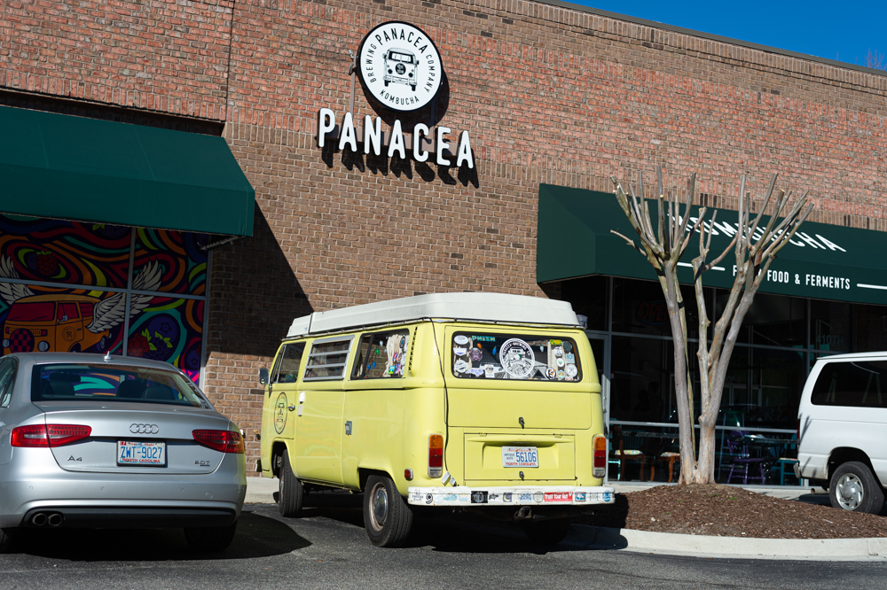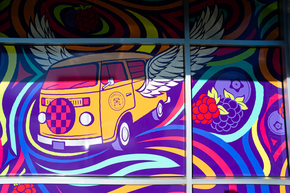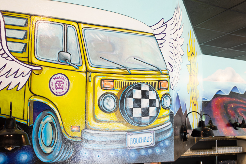 An artist who recently moved from California to Wilmington, Erica Nelson of Mural Modern, painted a large mural above the bar, which shows Panacea’s trademark yellow VW van, the “Boochbus,” with wings — a design created by Matt Ebbing of Ebbing Branding and Design for one of Panacea’s single-use kombucha bottle labels.