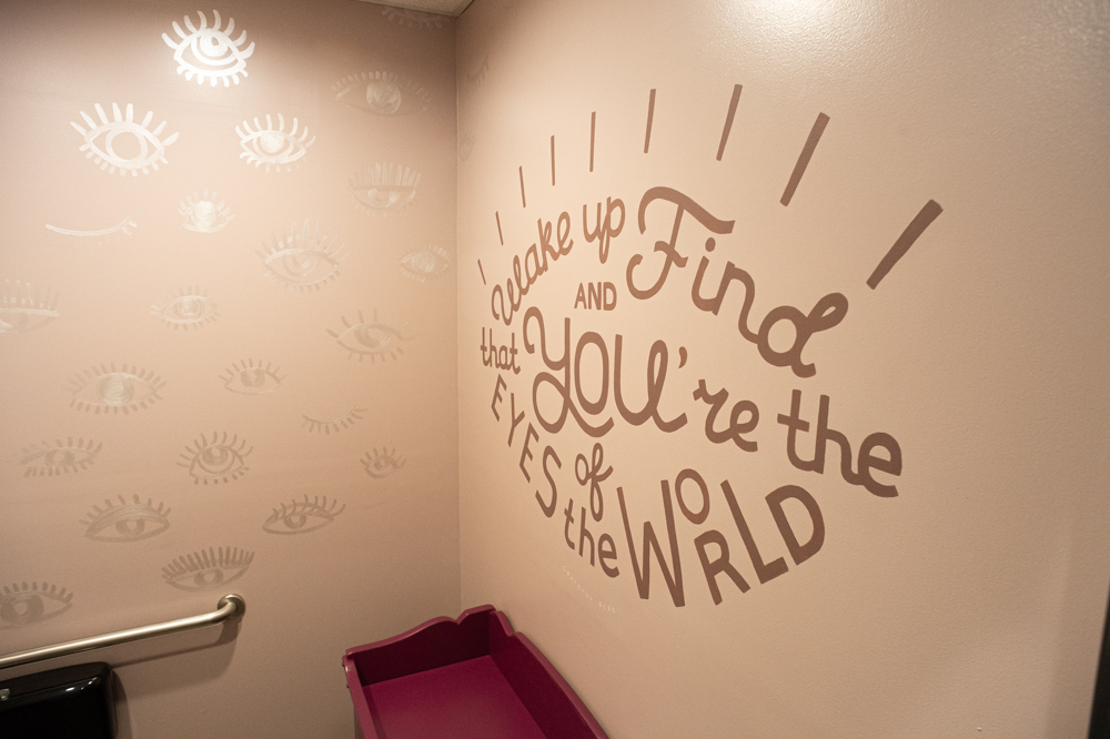 Lyrics from Hill’s favorite band, Grateful Dead, are painted throughout the space. On the wall of one of the bathrooms it reads, “Once in a while you get shown the light in the strangest of places if you look at it right,” above a smiling moon and sun.