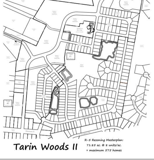 If a rezoning to R-5 was approved, the end total size of the Tarin Woods development would be 173.11 acres with 823 housing units — an average of 4.75 units per acre.