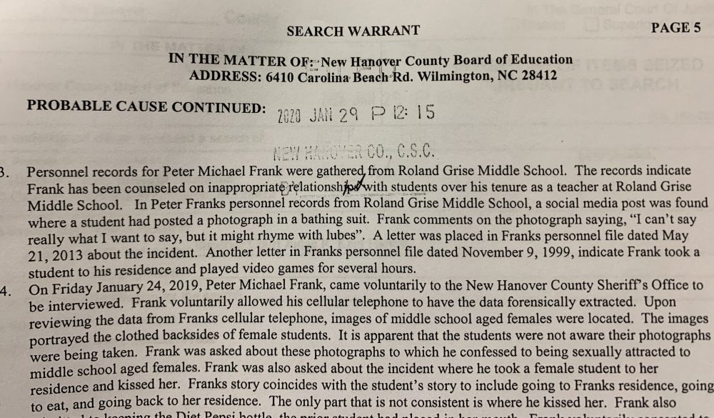 However, according to the search warrant, Frank had been ‘counseled’ repeatedly by New Hanover County Schools (NHCS) for inappropriate relationships with students.