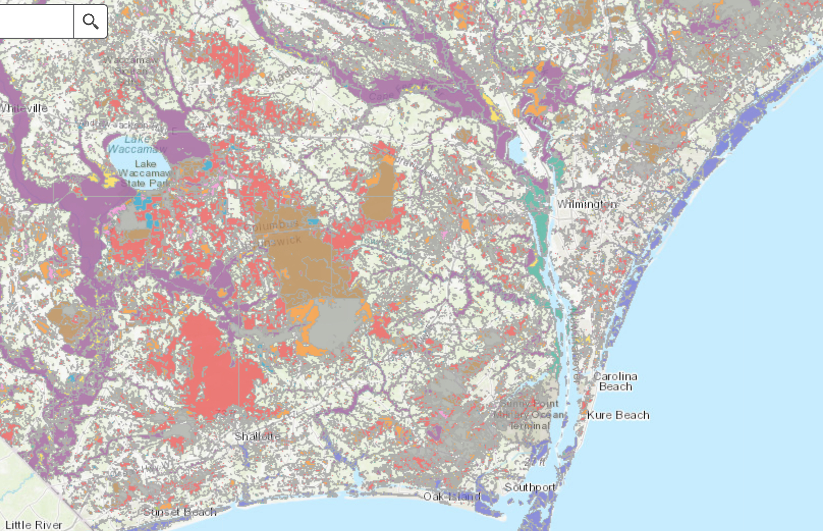 Below: Wetlands depicted in southeastern, North Carolina. View DEQ’s interactive mapping system.