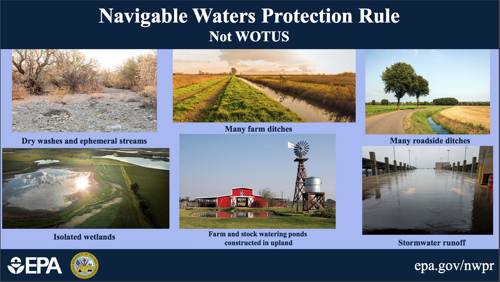 Below: A screenshot from the EPA’s WOTUS announcement depicting areas no longer federally protected under the Clean Water Act. The features of highest importance, environmentalists assert: streams temporarily filled by stormwater and wetlands that do not have a direct surface water connection to water bodies.