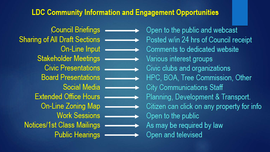 Council briefings, such as the one that took place on Monday morning, are always open to the public, they are also presented via webcast and will continue to be where staff provides updates to City Council, Harbeck said. When drafts for the new LDC are proposed, the city will also share these with the public within 24-hours of City Council receiving their copy.